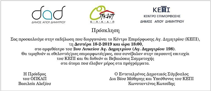 Το Κέντρο Επιμόρφωσης Αγίου Δημητρίου διοργανώνει εκδήλωση προ τιμήν των εθελοντών/ριών επιμορφωτών/ριών που συνέβαλαν στην περυσινή επιτυχία της δομής, τη Δευτέρα 18-2-2019 και ώρα 18:00, στο αμφιθέατρο του 2ου Λυκείου (Αγ. Δημητρίου 198). Παράλληλα, θα δοθούν βεβαιώσεις σε όλα τα άτομα που παρακολούθησαν τα επιμορφωτικά προγράμματα, ενώ θα γίνει και ενημέρωση για τα νέα προγράμματα του 2019.-
