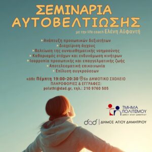 6:00 pm - 9:00 pmΣΕΜΙΝΑΡΙΑ ΑΥΤΟΒΕΛΤΙΩΣΗΣ-Το σεμινάριο στις 4 Δεκεμβρίου 2025 δεν θα γίνει. 6ο Δημοτικό Σχολείο • Αγ. Δημητρίου 186