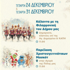 5:00 pm - 8:15 pmΧΡΙΣΤΟΥΓΕΝΝΙΑΤΙΚΕΣ ΣΥΝΑΥΛΙΕΣ ΣΤΗΝ ΑΙΘΟΥΣΑ ΣΥΝΑΥΛΙΩΝ ΤΟΥ ΔΗΜΟΤΙΚΟΥ ΩΔΕΙΟΥ ΔΗΜΟΤΙΚΟ ΩΔΕΙΟ ΑΓΙΟΥ ΔΗΜΗΤΡΙΟΥ
