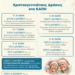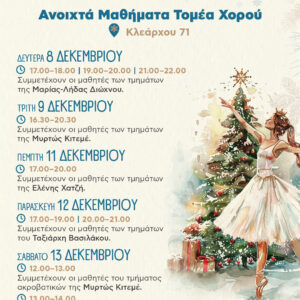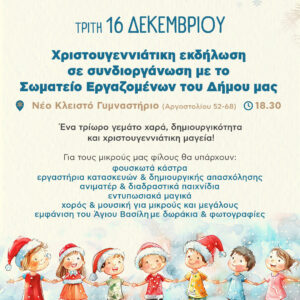 6:30 pm - 9:00 pmΧΡΙΣΤΟΥΓΕΝΝΙΑΤΙΚΗ ΓΙΟΡΤΗ με το Σωματείο Εργαζομένων του δήμου ΝΕΟ ΚΛΕΙΣΤΟ ΓΥΜΝΑΣΤΗΡΙΟ ΑΡΓΟΣΤΟΛΙΟΥ 52