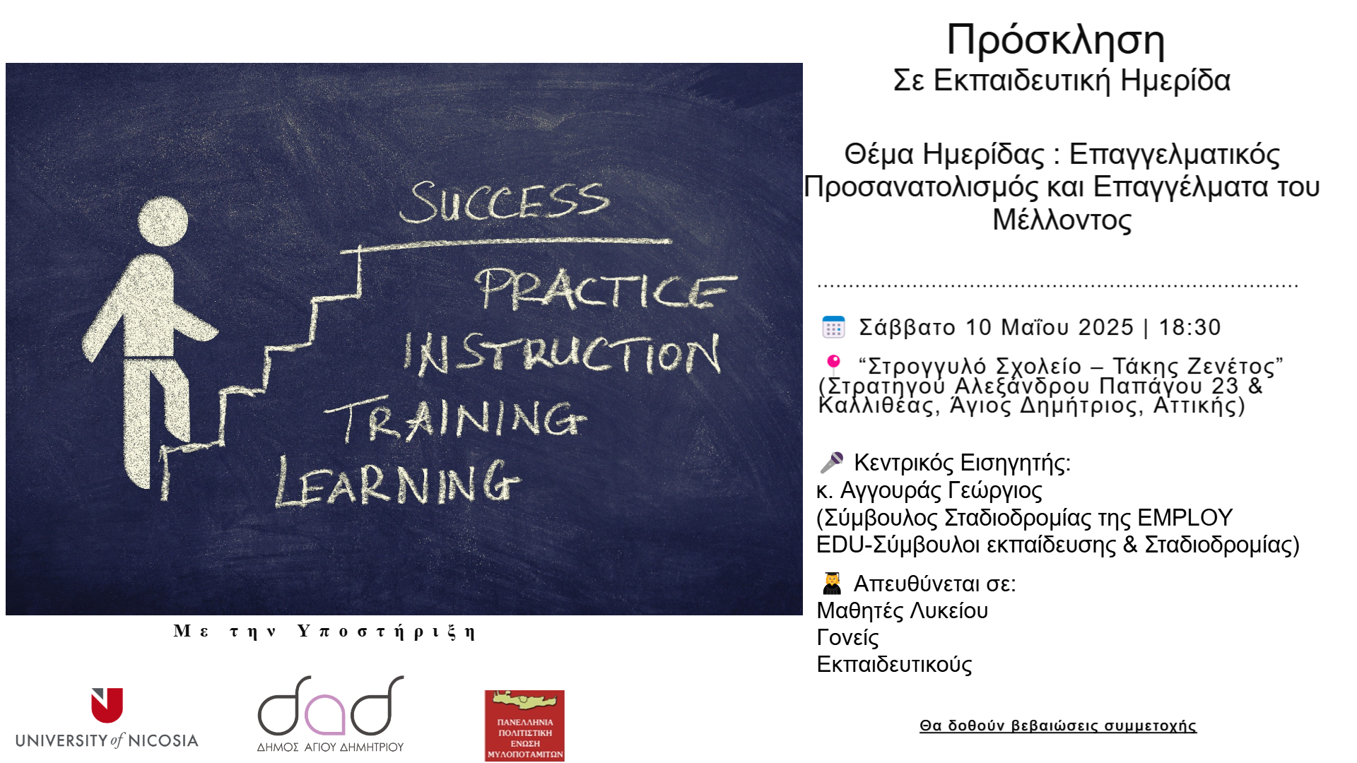 10 Μαΐου ημερίδα για τον επαγγελματικό Προσανατολισμό και τα Επαγγέλματα του Μέλλοντος στο Στρογγυλό Date 10 Μάιος 2025 Expired! Time 6:30 pm - 10:00 pm Location ΣΤΡΟΓΓΥΛΟ Category ΔΙΕΥΘΥΝΣΗ ΠΑΙΔΕΙΑΣΔΗΜΟΣ