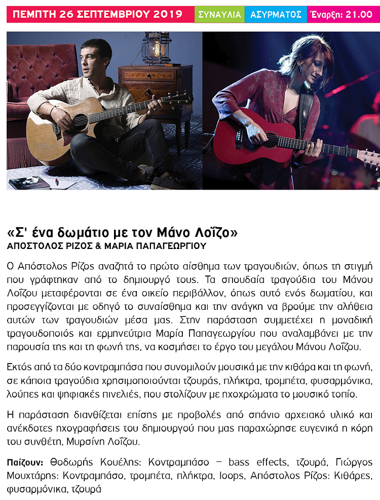 Αφιέρωμα στον Μάνο Λοΐζο με τον Απόστολο Ρίζο και την Μαρία Παπαγεωργίου Date 26 Σεπ 2019 Expired! Time 9:00 pm Location Πάρκο Ελ. Βενιζέλου • Ασύρματος