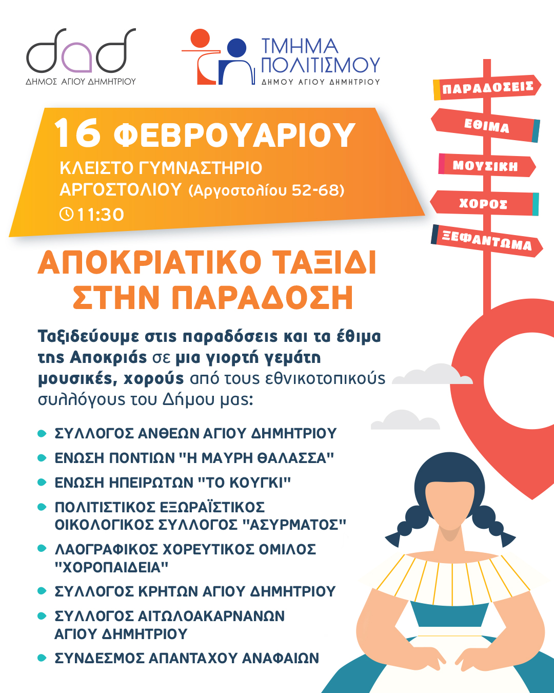 ΑΠΟΚΡΙΑΤΙΚΟ ΤΑΞΙΔΙ ΣΤΗΝ ΠΑΡΑΔΟΣΗ – ΚΛΕΙΣΤΟ ΓΥΜΝΑΣΤΗΡΙΟ – ΑΡΓΟΣΤΟΛΙΟΥ 68 στις11:30