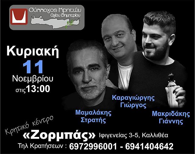 Φθινοπωρινό συναπάντημα με το Σύλλογο Κρητών Date 11 Νοέ 2018 Expired! Time 1:00 pm Location Ζορμπάς Ifigenias 3, Kallithea 176 72, Greece
