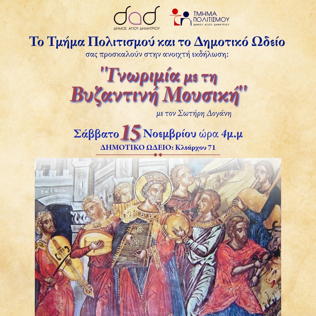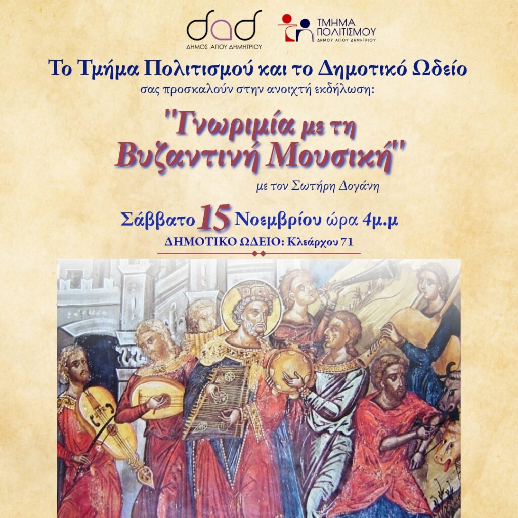 ΓΝΩΡΙΜΙΑ ΜΕ ΤΗΝ ΒΥΖΑΝΤΙΝΗ ΜΟΥΣΙΚΗ Date 15 Νοέ 2025 Expired! Time 4:00 pm - 6:00 pm Location ΔΗΜΟΤΙΚΟ ΩΔΕΙΟ ΑΓΙΟΥ ΔΗΜΗΤΡΙΟΥ Category ΠΟΛΙΤΙΣΜΟΣ