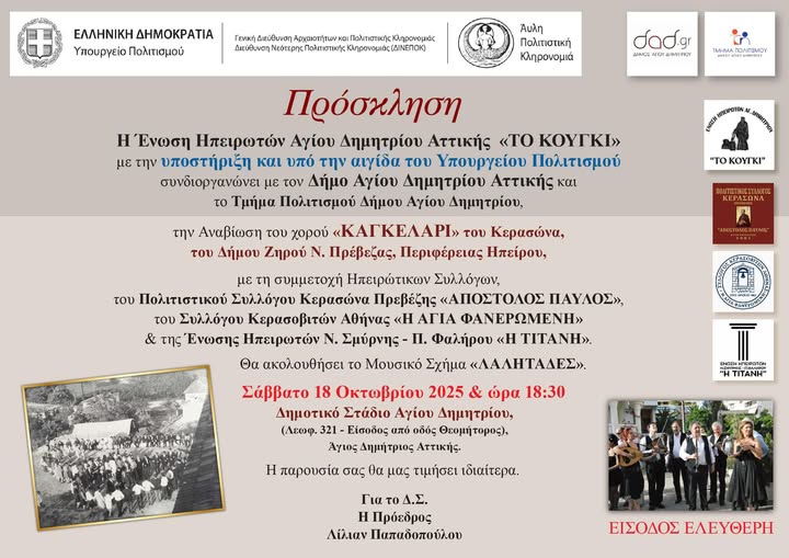 Η αναβίωση του χορού “Καγκελάρι” του Κερασώνα από την Ένωση Ηπειρωτών Date 18 Οκτ 2025 Expired! Time 6:00 pm - 10:00 pm Location ΔΗΜΟΤΙΚΟ ΣΤΑΔΙΟ Category ΠΟΛΙΤΙΣΜΟΣ
