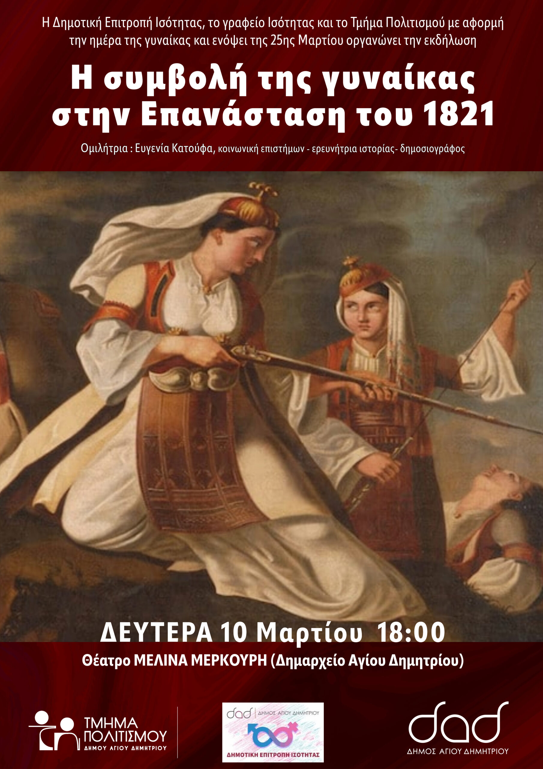 Η Συμβολή της γυναίκας στην Επανάσταση του 1821 Date 10 Μαρ 2025 Expired! Time 6:00 pm - 6:00 pm Location ΔΗΜΟΤΙΚΟ ΘΕΑΤΡΟ ΜΕΛΙΝΑ ΜΕΡΚΟΥΡΗ ΑΓ.ΔΗΜΗΤΡΙΟΥ Category ΔΕΠΙΣΠΟΛΙΤΙΣΜΟΣ