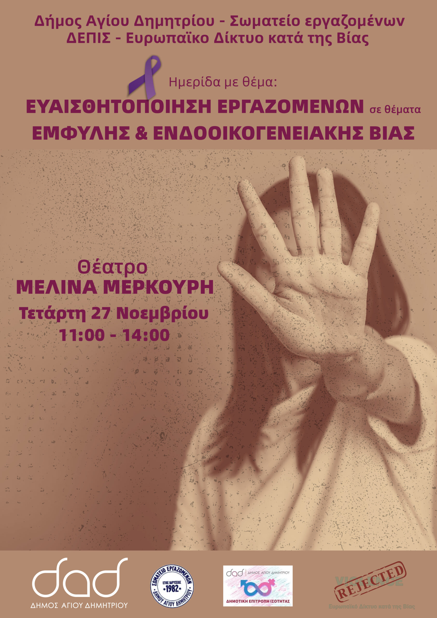 Ο Δήμος Αγίου Δημητρίου, το σωματείο εργαζομένων, η Δημοτική επιτροπή ισότητας (ΔΕΠΙΣ), και το Ευρωπαϊκό Δίκτυο κατά της Βίας, συνδιοργανώνουν