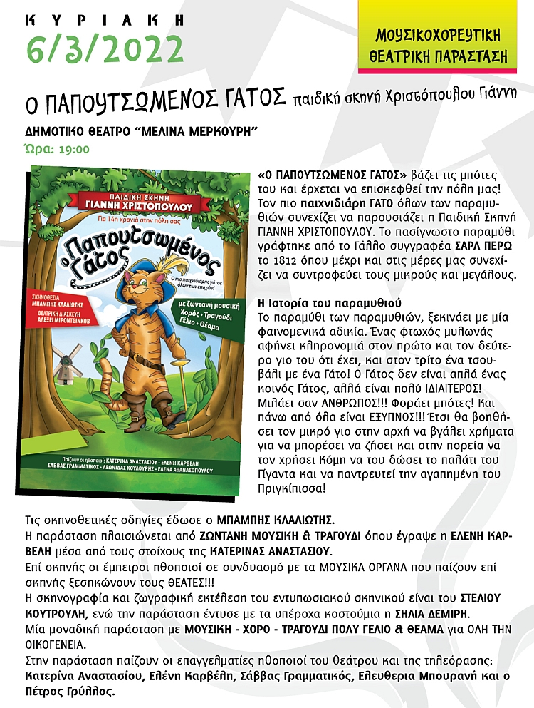 Ο Παπουτσωμένος Γάτος Date 06 Μαρ 2022 Expired! Time 7:00 pm Location Δημοτικό Θέατρο "Μελίνα Μερκούρη" • Αγ. Δημητρίου 55