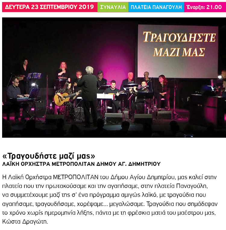 Συναυλία της ορχήστρας ΜΕΤΡΟΠΟΛΙΤΑΝ Date 23 Σεπ 2019 Expired! Time 9:00 pm Location Πλατεία Παναγούλη
