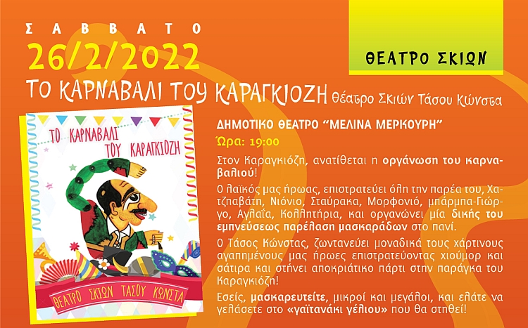 Θέατρο σκιών • Το καρναβάλι του Καραγκιόζη Date 26 Φεβ 2022 Expired! Location Δημοτικό Θέατρο "Μελίνα Μερκούρη" • Αγ. Δημητρίου 55
