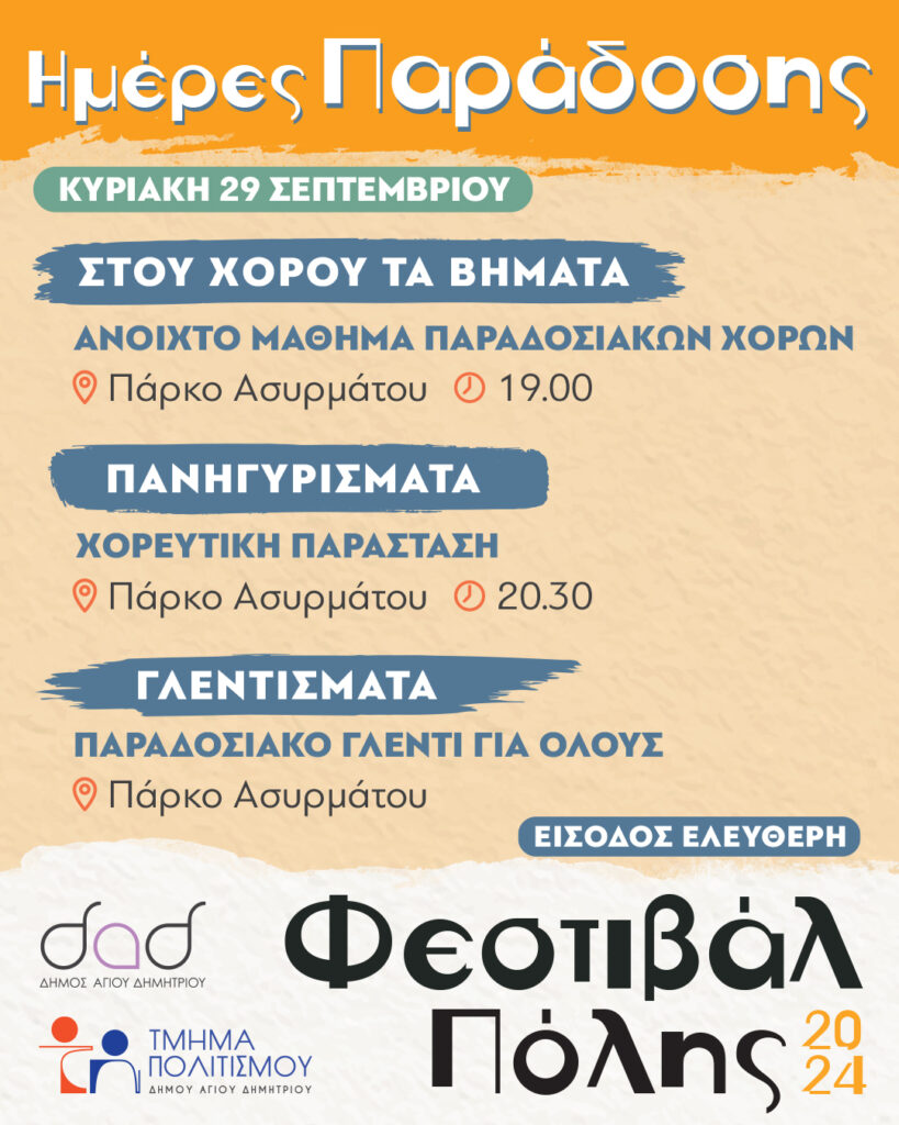 Το Φεστιβάλ Πόλης του Δήμου Αγίου Δημητρίου ολοκληρώνεται το ερχόμενο Σαββατοκύριακο 28 & 29 Σεπτεμβρίου. Το κλείσιμο του στο Πάρκο Ασυρμάτου είναι αφιερωμένο στην ελληνική μουσική παράδοση με μουσικές και χορούς από όλη την Ελλάδα.  Συγκεκριμένα: