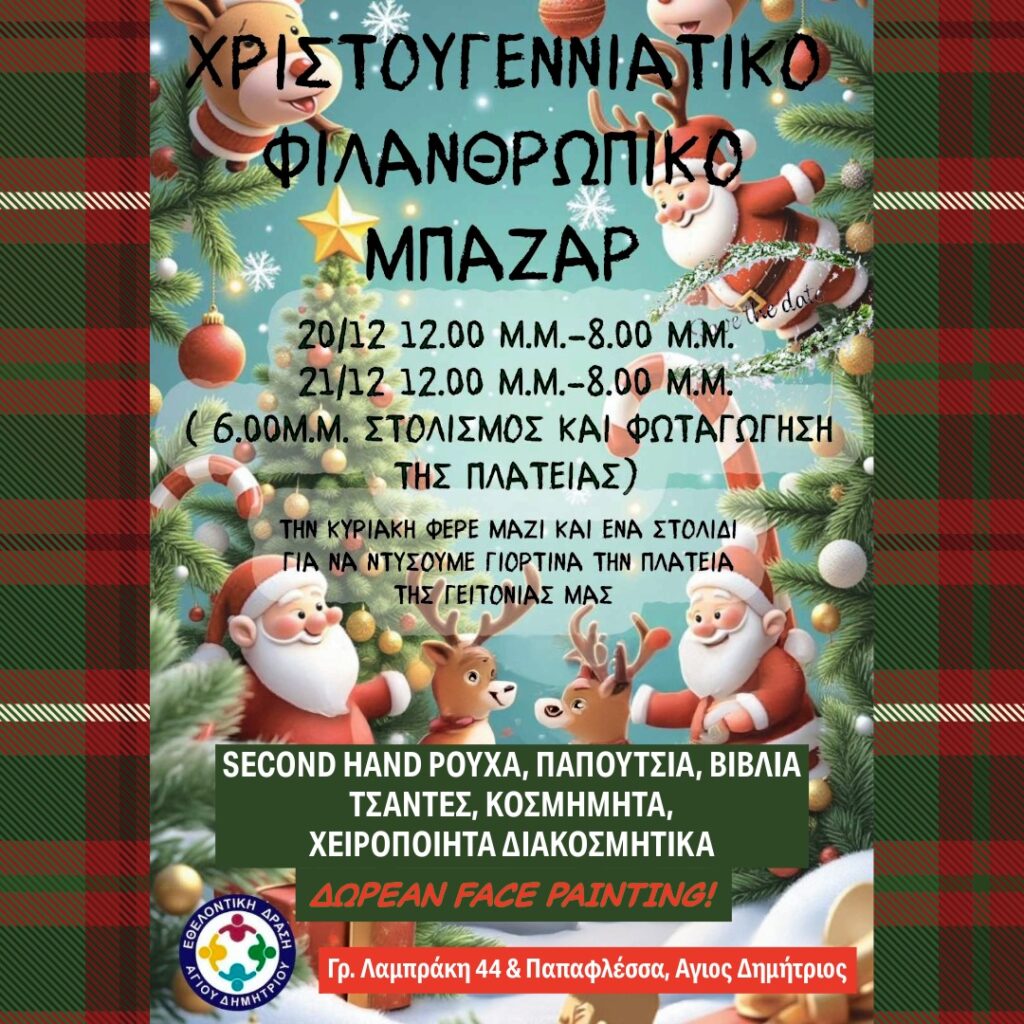 Η Εθελοντική Δράση Αγίου Δημητρίου διοργανώνει Φιλανθρωπικό Μπαζάρ στην Γρ.Λαμπράκη 44 & Παπαφλέσσα, στις 20 & 21 Δεκεμβρίου από τις 12 έως τις 8 το βράδυ.