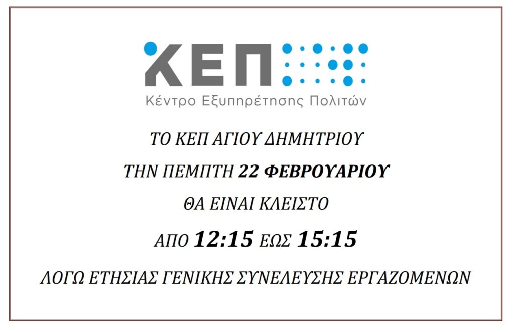 Κλειστό το ΚΕΠ Αγίου Δημητρίου την Πέμπτη 22 Φεβρουαρίου από τις 12:15 – 15:15
