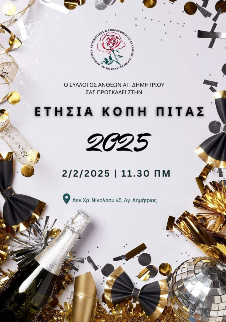 Ο Εξωραϊστικός Επιμορφωτικός Σύλλογος Περιοχής Ανθέων, του Δήμου Αγίου Δημητρίου, με χαρά σας προσκαλεί στην Ετήσια Κοπή Πίτας στον πολυχώρο του, στις 2 Φεβρουαρίου 2025, στις 11.30.