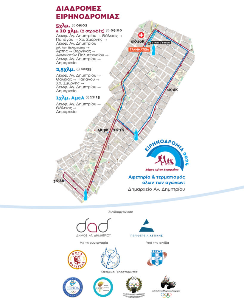 ΕιρηνοδρομίαΣτο πλαίσιο της διεξαγωγής της μεγάλης Ειρηνοδρομίας που διεξάγεται την Κυριακή 19 Μαΐου στο Δήμο Αγίου Δημητρίου και εντάσσεται στις εκδηλώσεις «Παναγούλεια 2024», για την ασφάλεια των αθλητών δρομέων και του συνόλου των συμμετεχόντων θα πραγματοποιηθούν Κυκλοφοριακές ρυθμίσεις. Οι κυκλοφοριακές ρυθμίσεις θα ισχύσουν από τις 08:00 π.μ. έως και τη λήξη της Ειρηνοδρομίας.