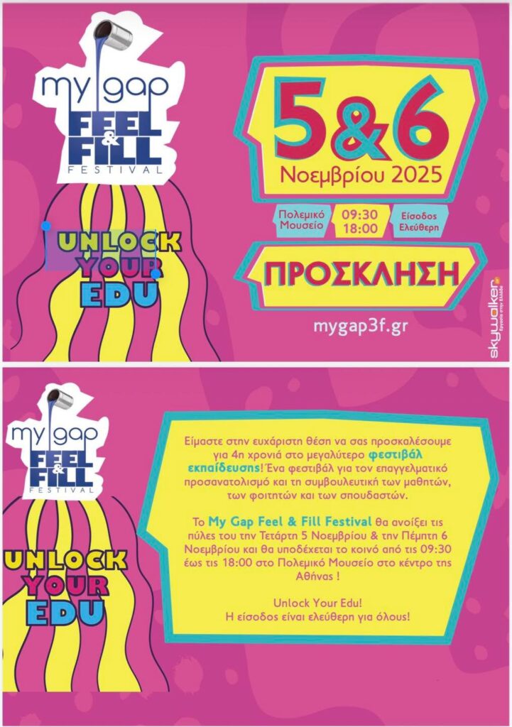 Ομάδα μαθητριών και μαθητών του Κοινωνικού Φροντιστηρίου Αγίου Δημητρίου, με τη συνοδεία της συντονίστριας κας Ευαγγελίας Νικολακοπούλου και της γραμματέως μας κας Αθηνάς Καγκαρά, συμμετείχε στο Φεστιβάλ Εκπαίδευσης “My Gap Feel & Fill Festival”, που πραγματοποιήθηκε την Τετάρτη 5 Νοεμβρίου 2025 στο Πολεμικό Μουσείο Αθηνών.