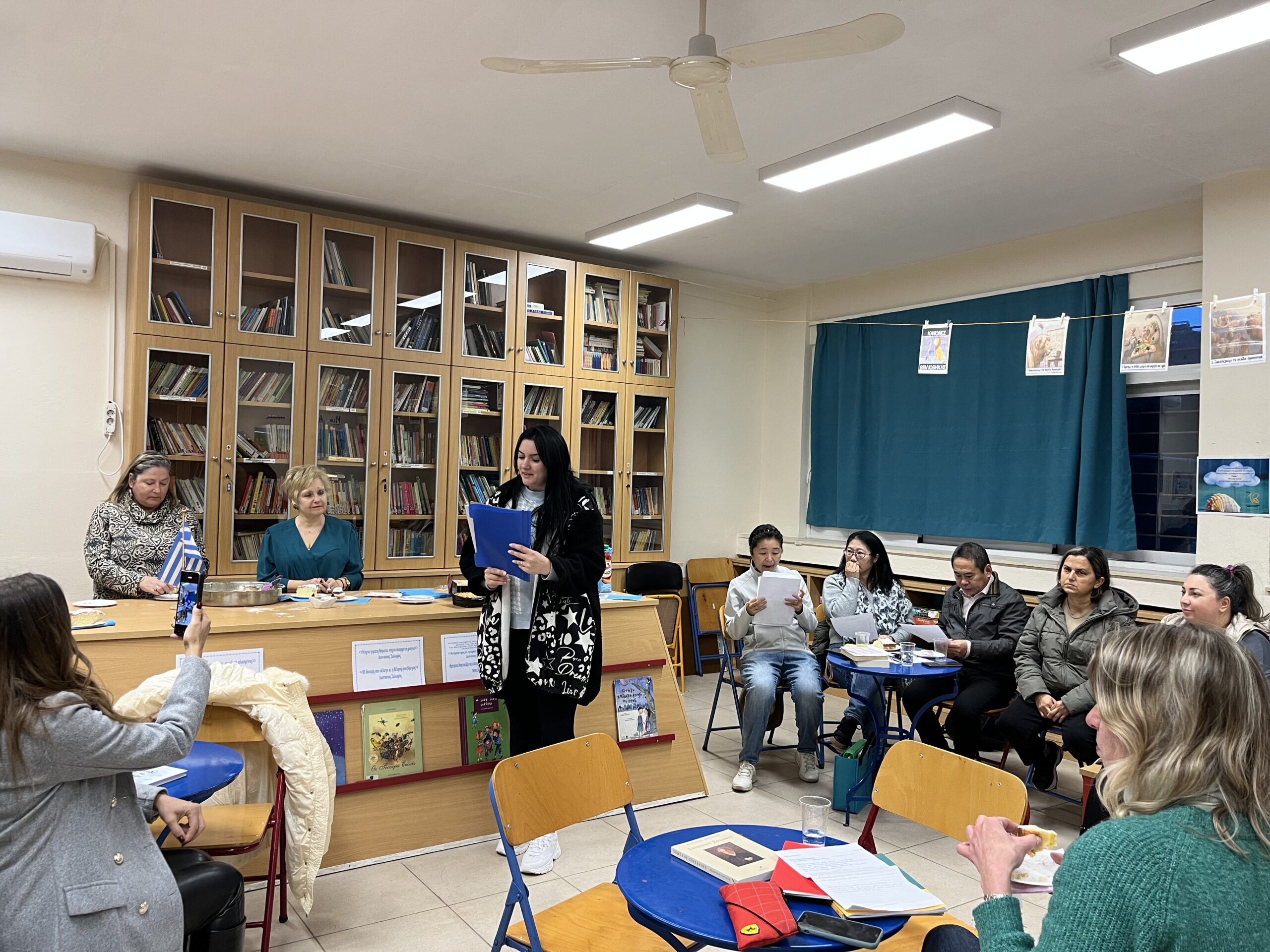 Με μεγάλη επιτυχία πραγματοποιήθηκε την Τρίτη 10 Φεβρουαρίου η εκδήλωση αφιερωμένη στην Παγκόσμια Ημέρα Ελληνικής Γλώσσας, από την ομάδα μαθημάτων Ελληνικών ενηλίκων «Μαθαίνω Ελληνικά, Επικοινωνώ, Συμμετέχω στην κοινότητα». Η δράση φιλοξενήθηκε στη Βιβλιοθήκη του 13ου Δημοτικού Σχολείου Αγίου Δημητρίου, έναν χώρο που έγινε το «κοινό σπίτι» για εκπαιδευόμενους/-ες, εθελόντριες εκπαιδευτικούς, νέους γονείς και μέλη της τοπικής κοινότητας, δημιουργώντας μια ατμόσφαιρα ζεστασιάς και ουσιαστικής αλληλεπίδρασης.