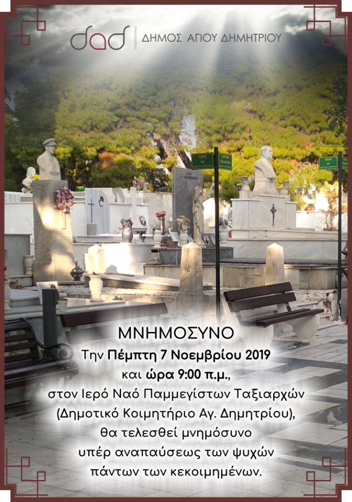Την Πέμπτη 7/11/2019 και ώρα 9:00 π.μ., στον Ιερό Ναό Παμμεγίστων Tαξιαρχών (Δημοτικό Κοιμητήριο Αγίου Δημητρίου), θα τελεσθεί μνημόσυνο υπέρ αναπαύσεως των ψυχών πάντων των κεκοιμημένων.-