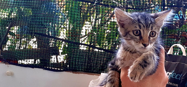 Είναι 3 μηνών, αποπαρασιτωμένη και υγιής, πολύ πολύ κούκλα όπως βλέπετε και θα γίνει φουντωτή. Είναι ακόμα λίγο φοβισμένη, αλλά όταν τη χαϊδεύουμε γουργουρίζει πολύ δυνατά.