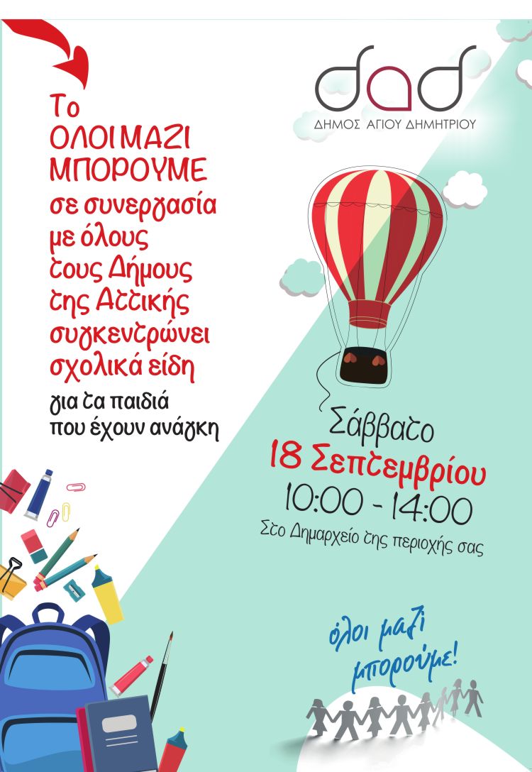 Από ώρα 10:00 έως 14:00, σας περιμένουμε στο Δημαρχείο (Αγ. Δημητρίου 55), προκειμένου να μαζέψουμε τσάντες, τετράδια, μολύβια και στυλό για τα παιδιά του Δήμου μας.