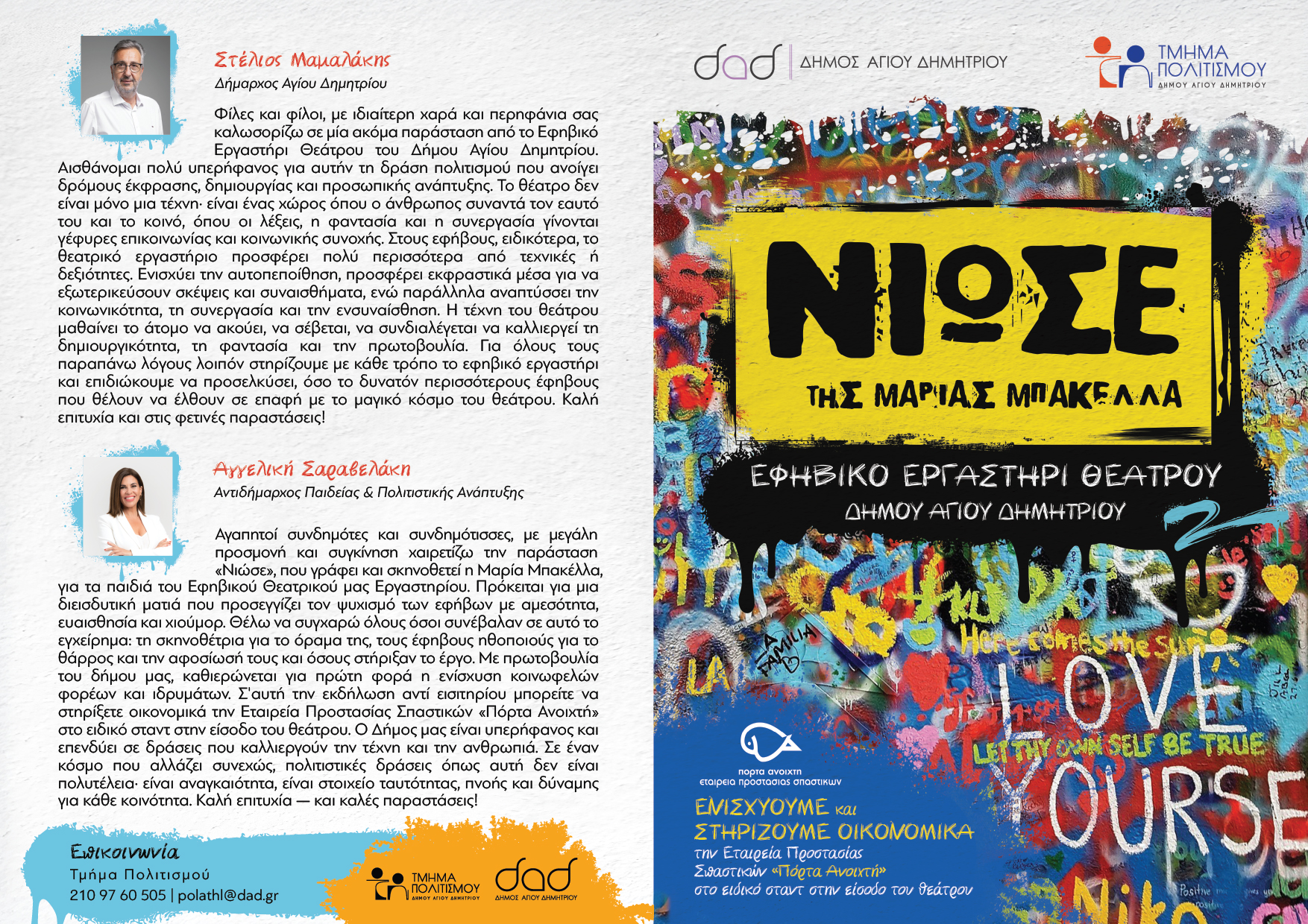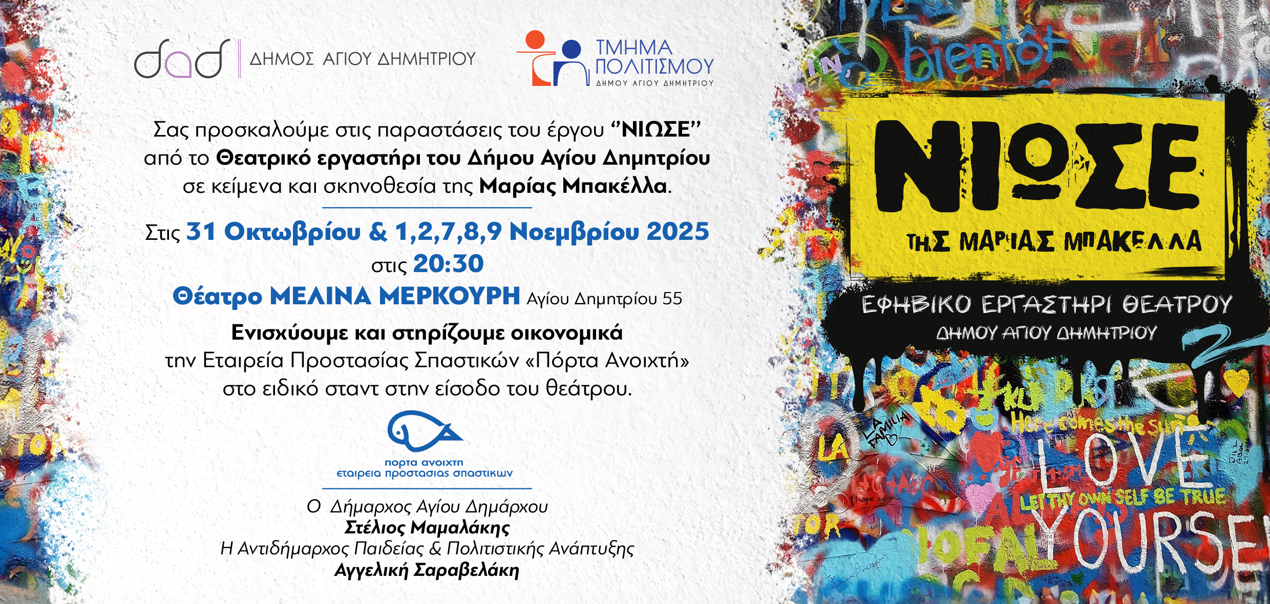 Οι έξι παραστάσεις, θα είναι δωρεάν για το κοινό και θα φιλοξενηθούν στο Θέατρο «Μελίνα Μερκούρη» (Δημαρχείο Αγίου Δημητρίου 55) στις 31 Οκτωβρίου & 1, 2, 7, 8, 9 Νοεμβρίου 2025. Αντί εισιτηρίου οι θεατές μπορούν να ενισχύσουν οικονομικά την Εταιρεία Προστασίας Σπαστικών “Πόρτα Ανοικτή” στο ειδικό σταντ που θα υπάρχει στην είσοδο του θεάτρου!