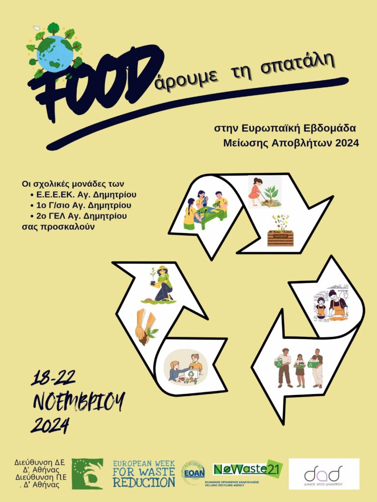 Οι σχολικές μονάδες, Ε.Ε.Ε.ΕΚ Αγίου Δημητρίου, 1ο Γυμνάσιο Αγίου Δημητρίου και 2ο Γενικό Λύκειο Αγίου Δημητρίου, συμπράττουν και προσκαλούν τις σχολικές μονάδες Α/θμιας και Β/θμιας Εκπαίδευσης της Δ΄ Αθήνας, να συμμετάσχουν στις βιωματικές δράσεις περιβαλλοντικής ευαισθητοποίησης που διοργανώνουν στο πλαίσιο της Ευρωπαϊκής Εβδομάδας Μείωσης Αποβλήτων EWWR 2024. Ο τίτλος της δράσης είναι: «FOODάρουμε τη Σπατάλη»