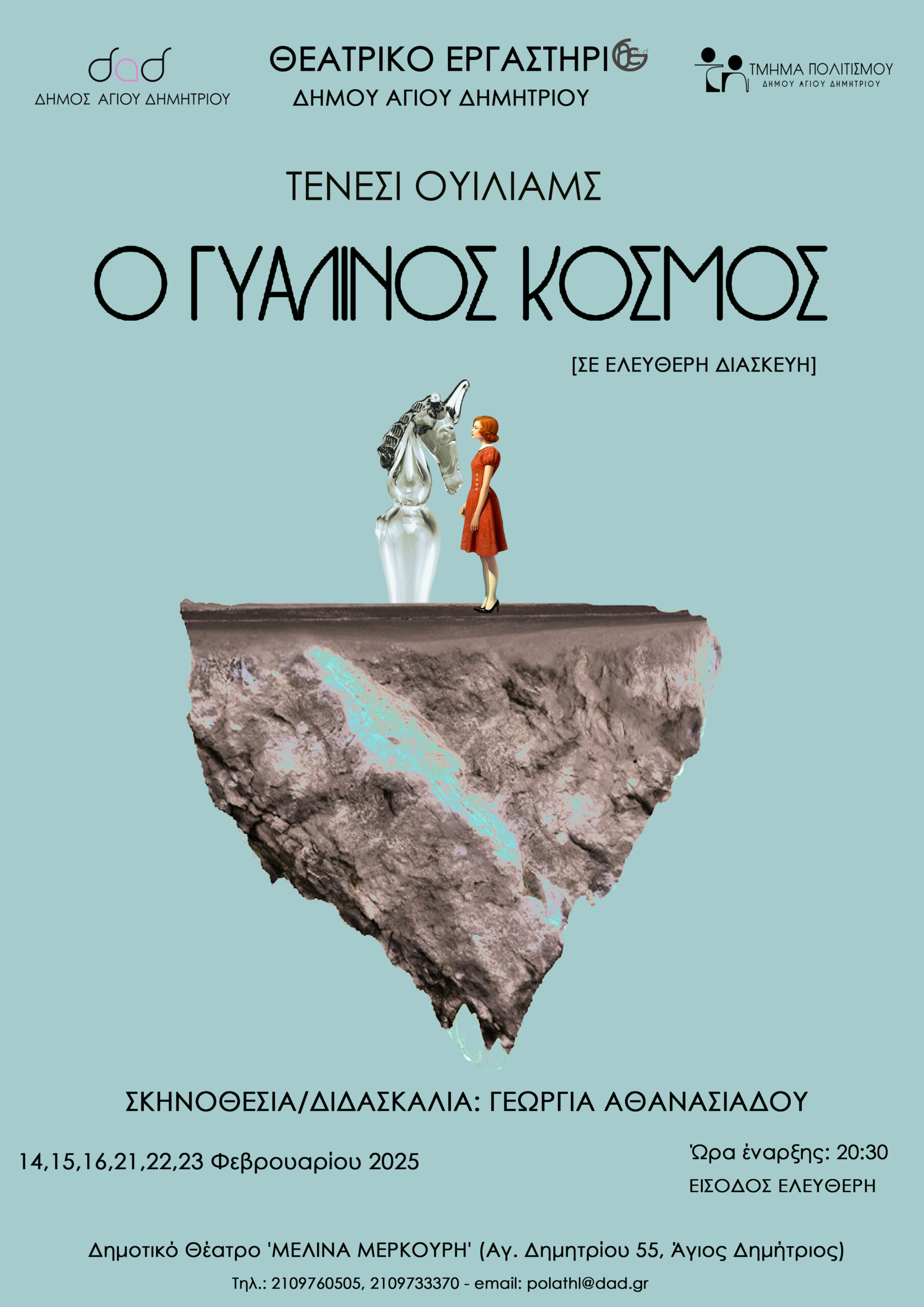 Το Θεατρικό Εργαστήρι του Δήμου Αγίου Δημητρίου, που έχει δημιουργήσει παράδοση με τις πολύ επιτυχημένες και ιδιαίτερα δημοφιλείς παραστάσεις του, επιστρέφει επί σκηνής με μία ακόμα, άκρως ενδιαφέρουσα παράσταση! Αυτή τη φορά  παρουσιάζει το έργο του Τενεσί Ουίλιαμς «Ο Γυάλινος Κόσμος», σε ελεύθερη διασκευή και σκηνοθεσία – διδασκαλία της Γεωργίας Αθανασιάδου.