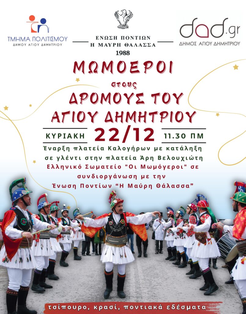 Στο πλαίσιο των εορταστικών εκδηλώσεων “Μια Πόλη – Μια Γιορτή”, για τα Χριστούγεννα και την Πρωτοχρονιά, ο Δήμος Αγίου Δημητρίου και ο Σύλλογος Ποντίων “Η Μαύρη Θάλασσα” οργανώνουν την Κυριακή 22 Δεκεμβρίου, στις 11:30 πμ, το παραδοσιακό δρώμενο “Μωμοέρια” με αφετηρία την πλατεία Καλογήρων, περιπλάνηση στους δρόμους της πόλης (Αγίου Δημητρίου) και τελικό προορισμό την πλατεία Άρη Βελουχιώτη, όπου προγραμματίζεται γλέντι με τσίπουρο, κρασί και παραδοσιακά εδέσματα!