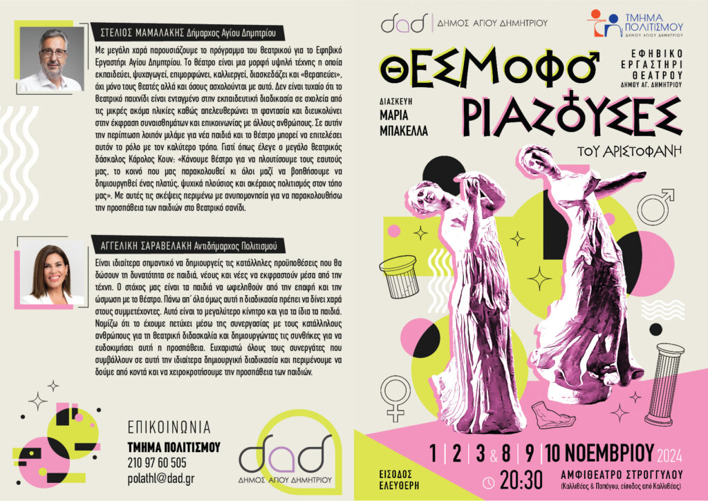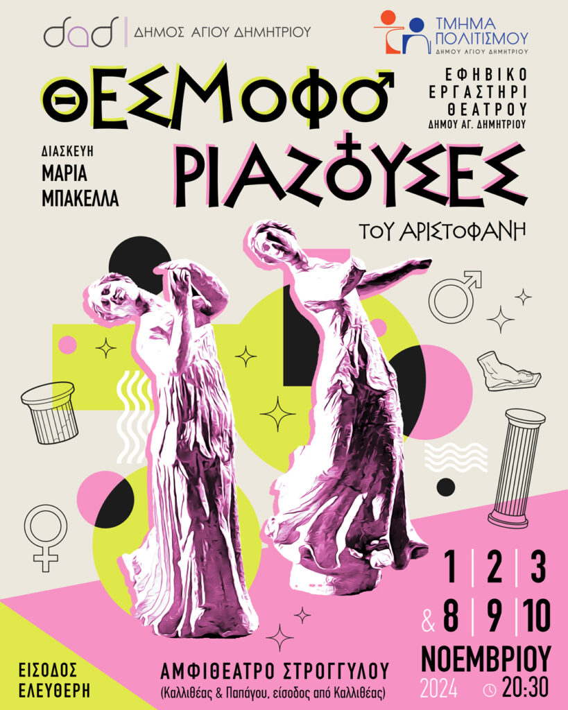 Το εφηβικό εργαστήρι θεάτρου, με τη γνωστή του ζωντάνια και ενέργεια, μετά την «Λυσιστράτη» φέρνει ξανά στη σκηνή, ένα ακόμα έργο του Αριστοφάνη. Αυτή τη φορά την περίφημη κωμωδία «Θεσμοφοριάζουσες» που θα παρουσιαστεί στις 1 – 2 – 3 και 8 – 9 & 10 Νοεμβρίου 2024, στις 20:30 στο Αμφιθέατρο του Στρογγυλού Σχολείου (Καλλιθέας & Παπάγου, είσοδος από Καλλιθέας). Η είσοδος είναι ελεύθερη για το κοινό