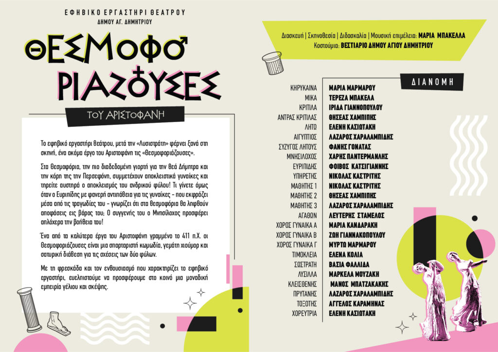 Οι Θεσμοφοριάζουσες είναι ένα από τα καλύτερα έργα του Αριστοφάνη γραμμένο το 411 π.Χ.. Πρόκειται για μια σπαρταριστή κωμωδία, γεμάτη χιούμορ και σατυρική διάθεση για τις σχέσεις των δύο φύλων. Με τη φρεσκάδα και τον ενθουσιασμό που χαρακτηρίζει το εφηβικό εργαστήρι, ευελπιστούμε να προσφέρουμε στο κοινό μια μοναδική εμπειρία γέλιου και σκέψης.