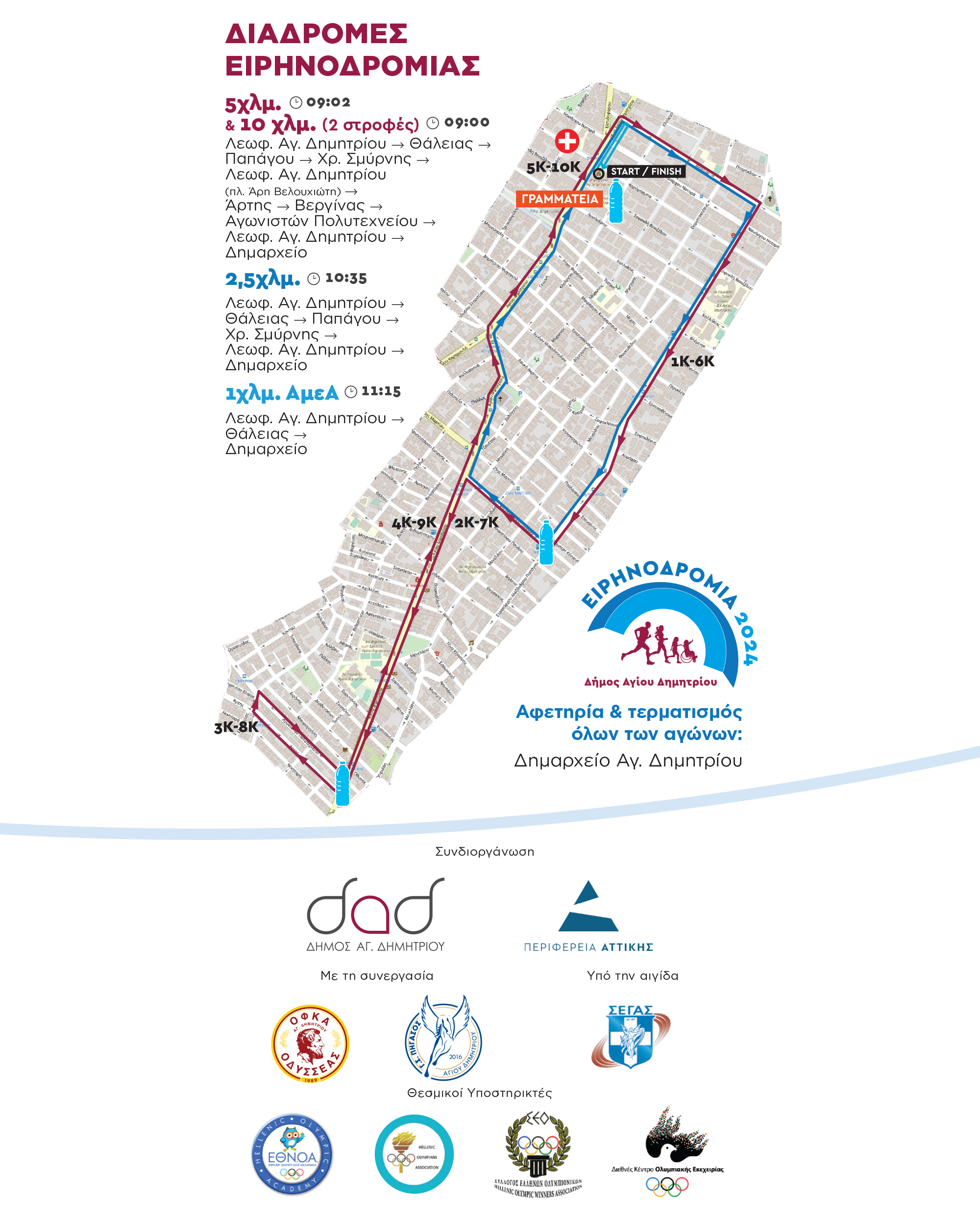Περιγραφή διαδρομής των 5χλμ κ 10 χλμ: Λεωφ. Αγ. Δημητρίου- Θάλειας – Παπάγου- Χρ. Σμύρνης –Λεωφ. Αγ. Δημητρίου – (πλ. Άρη Βελουχιώτη) – Άρτης- Βεργίνας- Αγωνιστών Πολυτεχνείου-Λεωφ. Αγ. Δημητρίου – Δημαρχείο.