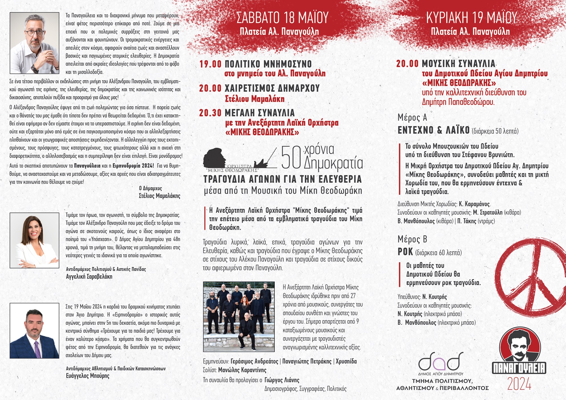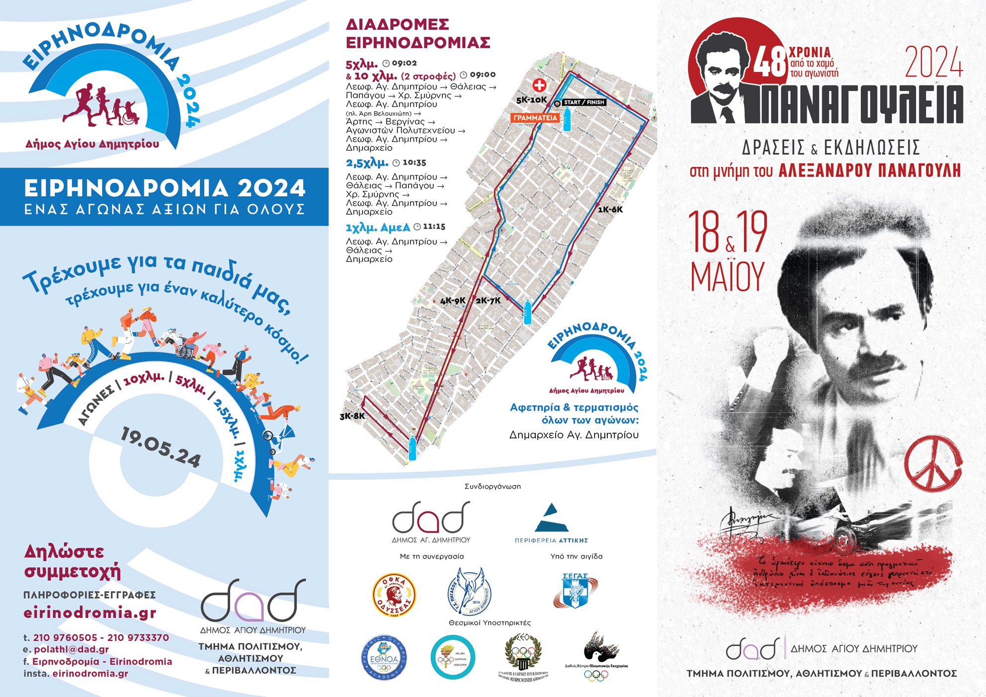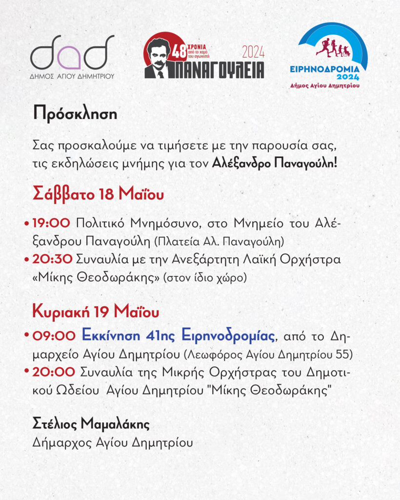 Ο Δήμος Αγίου Δημητρίου διοργανώνοντας για άλλη μια χρονιά τα Παναγούλεια και την Ειρηνοδρομία 2024, τιμά τη μνήμη του μεγάλου αγωνιστή της Δημοκρατίας Αλέξανδρου Παναγούλη στις 18 και 19 Μάϊου 2024.