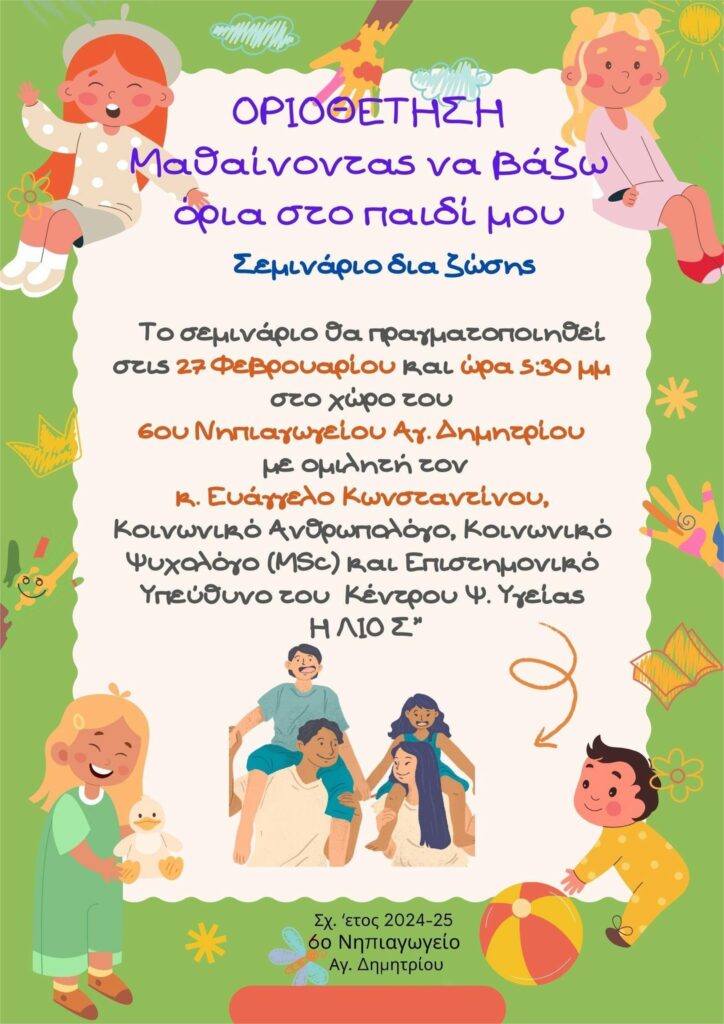 Το ΚΕΝΤΡΟ ΠΡΟΛΗΨΗΣ ΤΩΝ ΕΞΑΡΤΗΣΕΩΝ ΚΑΙ ΠΡΟΑΓΩΓΗΣ ΤΗΣ ΨΥΧΟΚΟΙΝΩΝΙΚΗΣ ΥΓΕΙΑΣ ΤΩΝ ΔΗΜΩΝ ΝΕΑΣ ΣΜΥΡΝΗΣ ΚΑΙ ΑΓΙΟΥ ΔΗΜΗΤΡΙΟΥ «ΗΛΙΟΣ», διοργανώνει την Πέμπτη 27 Φεβρουαρίου 2025 και ώρα 17:30 ομιλία και συζήτηση με γονείς και παιδαγωγούς, στο χώρο του 6ου Νηπιαγωγείου του Αγίου Δημητρίου (Μενελάου 74) με θέμα: