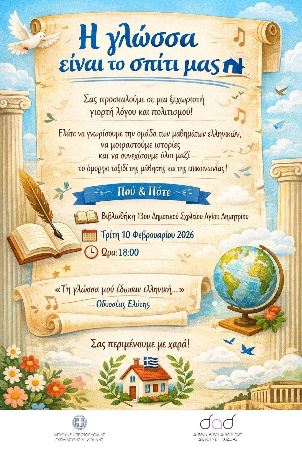 Οι εκπαιδευτές και οι εκπαιδευόμενοι των μαθημάτων ελληνικών ενηλίκων μας προσκαλούν να γιορτάσουμε μαζί την Παγκόσμια Ημέρα Ελληνικής Γλώσσας (9/2), την Τρίτη 10 Φεβρουαρίου στις 18:00, στο 13ο Δημοτικό Σχολείο Αγίου Δημητρίου (Αργοστολίου 118).