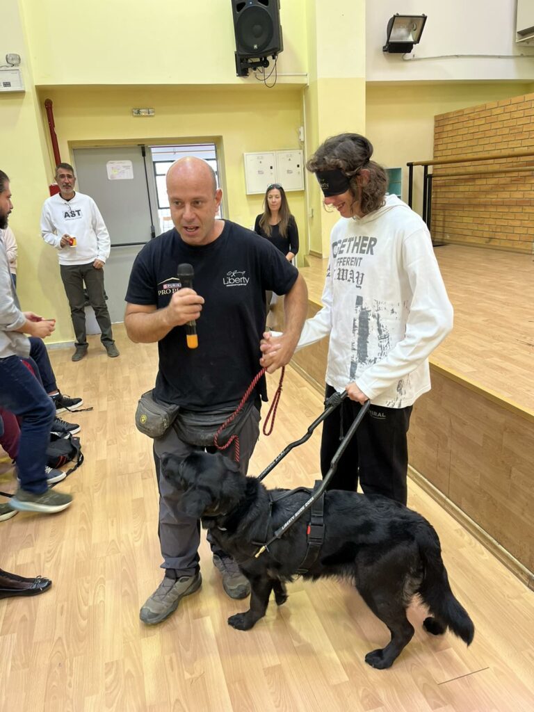 Μαζί του βρισκόταν και ένας σκύλος-οδηγός, συνοδευόμενος από τον εκπαιδευτή του, οι οποίοι με πρακτικό και συγκινητικό τρόπο έδειξαν πώς η καθοδήγησή του συμβάλλει στην ασφαλή μετακίνηση και τον προσανατολισμό των ατόμων με οπτική αναπηρία.