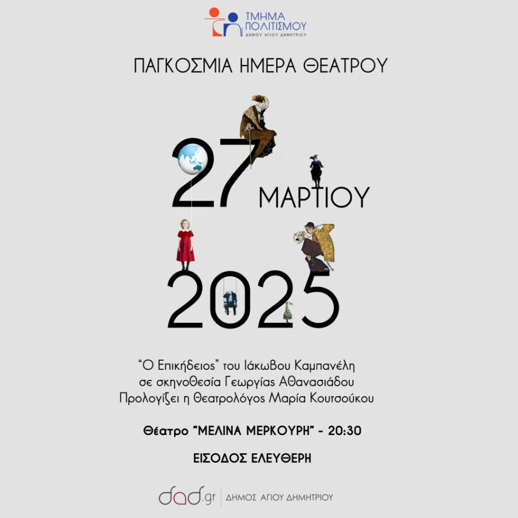 Με αφορμή την Παγκόσμια Ημέρα Θεάτρου (27/03) το Τμήμα Πολιτισμού του Δήμου Αγίου Δημήτριου παρουσιάζει την παράσταση του Ιάκωβου Καμπανέλλη «Ο Επικήδειος» σε σκηνοθεσία της Γεωργίας Αθανασιάδου. Προλογίζει η Θεατρολόγος Μαρία Κουτσούκου.