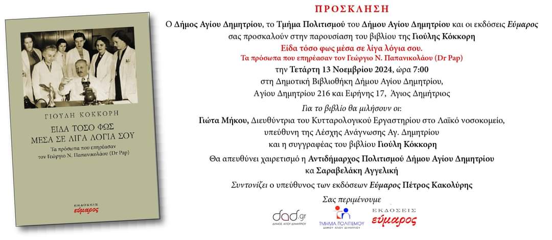 Ο Δήμος Αγίου Δημητρίου και το Τμήμα Πολιτισμού οργανώνουν την Τετάρτη 13 Νοεμβρίου 2024 στις 7.00 μμ,  την παρουσίαση του βιβλίου της Γιούλης Κόκκορη, με τίτλο : “Είδα τόσο φως μέσα σε λίγα λόγια σου”  / Τα πρόσωπα που επηρέασαν τον Γεώργιο Ν. Παπανικολάου ( Dr Pap), Εκδόσεις Εύμαρος.