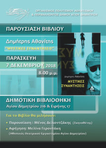 Την Παρασκευή 7 Δεκεμβρίου 2018 και ώρα 20:00, στη Δημοτική Βιβλιοθήκη Αγίου Δημητρίου (Αγ. Δημητρίου 216 & Ειρήνης 17), θα γίνει παρουσίαση του βιβλίου “Μυστικές συναντήσεις”, του Δημήτρη Αθανίτη. Την παρουσίαση θα κάνει ο σκηνοθέτης Μένος Δελιοντζάκης, ενώ αποσπάσματα του βιβλίου θα διαβάσει η ηθοποιός του Θεατρικού Εργαστηρίου Αγίου Δημητρίου, Μελίνα Γεροντάκη.-