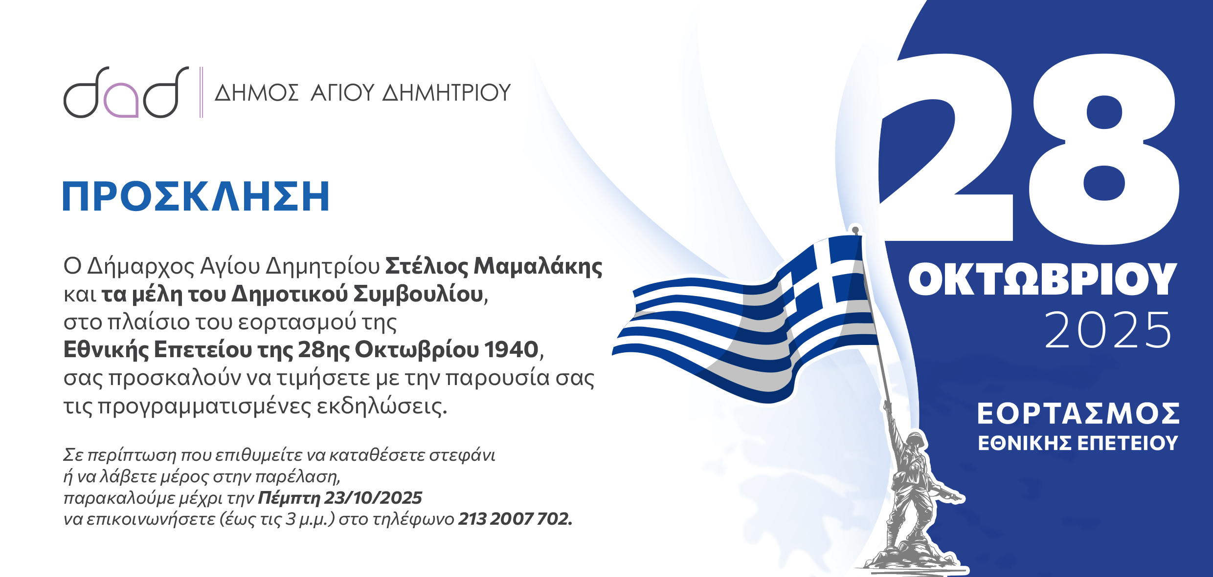 Ο Δήμαρχος Αγίου Δημητρίου Στέλιος Μαμαλάκης και τα μέλη του Δημοτικού Συμβουλίου, στο πλαίσιο του εορτασμού της  Εθνικής Επετείου της 28ης Οκτωβρίου 1940, σας προσκαλούν να τιμήσετε με την παρουσία σας τις προγραμματισμένες εκδηλώσεις.