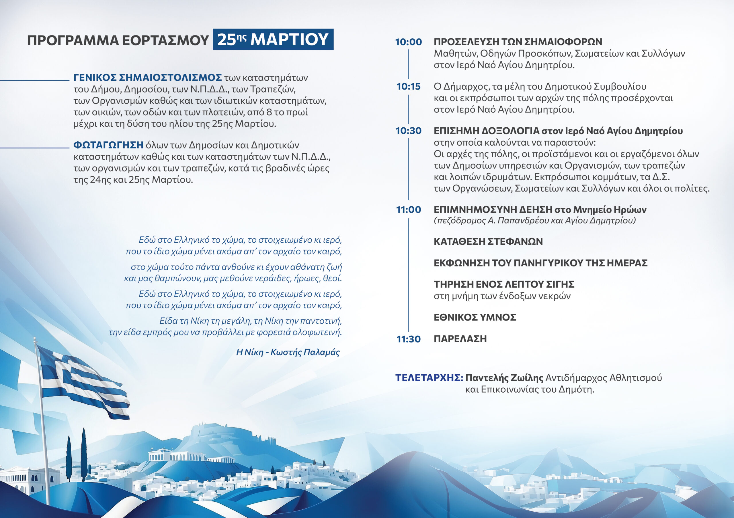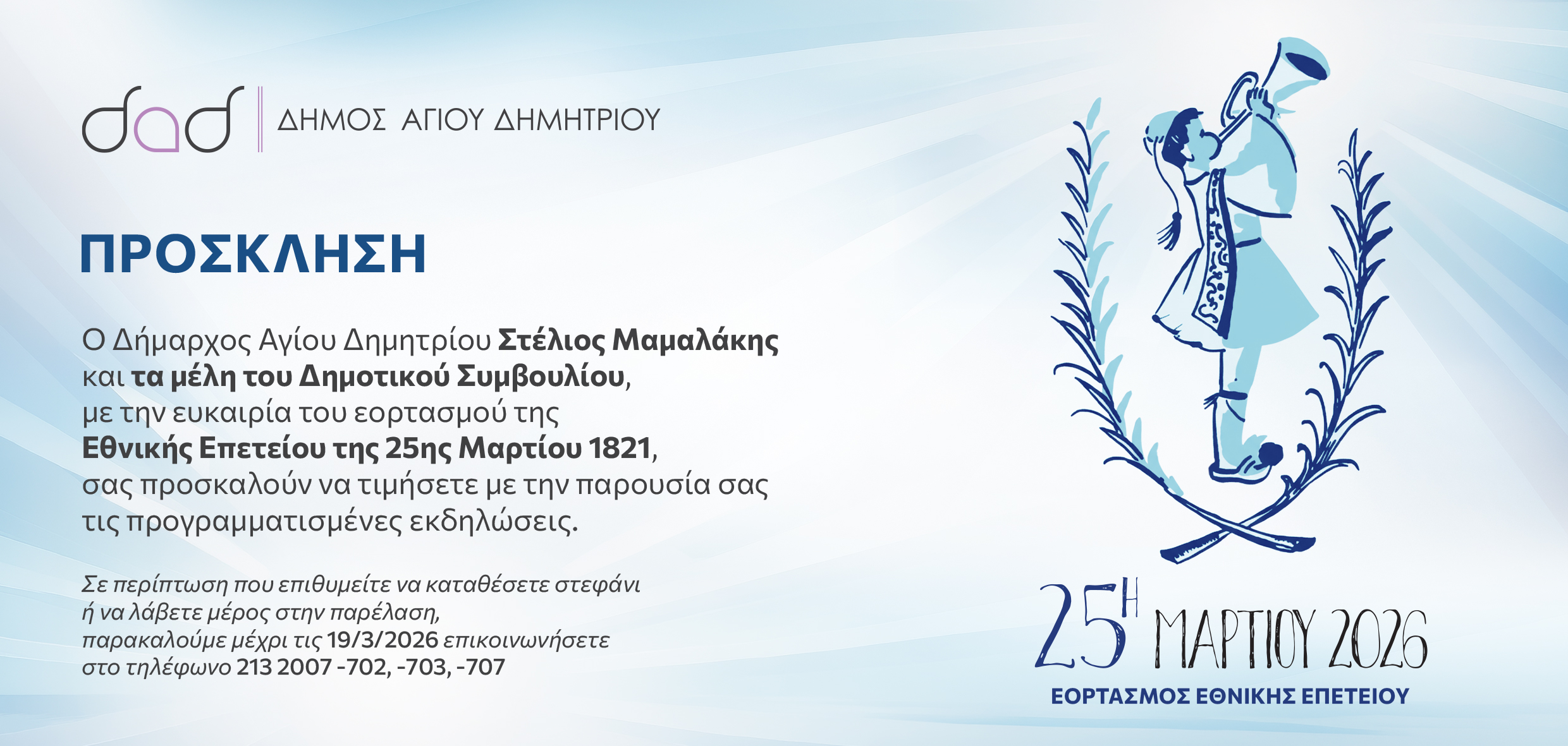 Ο Δήμαρχος Αγίου Δημητρίου Στέλιος Μαμαλάκης και τα μέλη του Δημοτικού Συμβουλίου, με την ευκαιρία του εορτασμού της Εθνικής Επετείου της 25ης Μαρτίου 1821, σας προσκαλούν να τιμήσετε με την παρουσία σας τις προγραμματισμένες εκδηλώσεις.