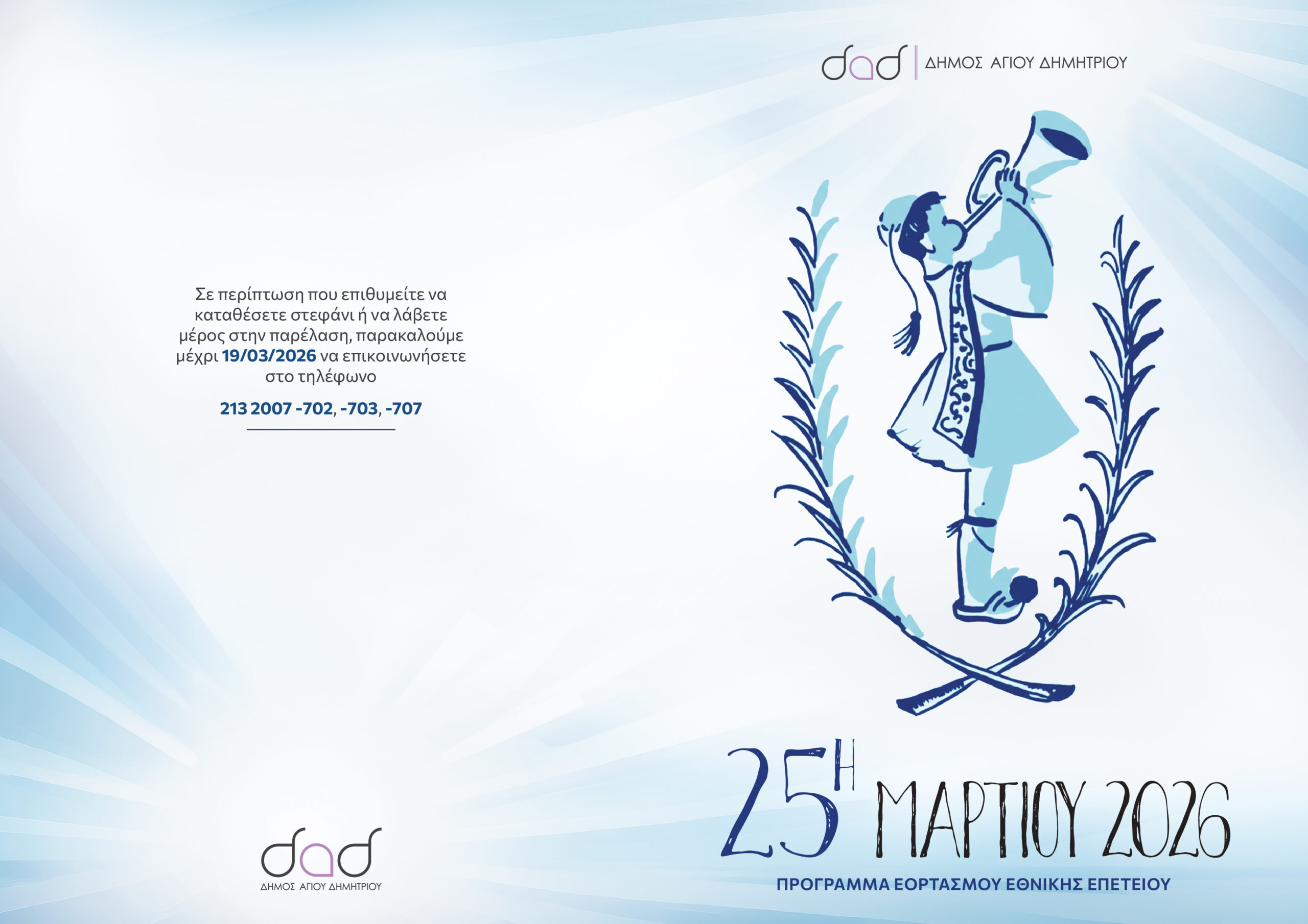 Σε περίπτωση που επιθυμείτε να καταθέσετε στεφάνι ή να λάβετε μέρος στην παρέλαση, παρακαλούμε μέχρι την 19/3/2026 να επικοινωνήσετε στο τηλέφωνο 2132007 702, 703, 707.