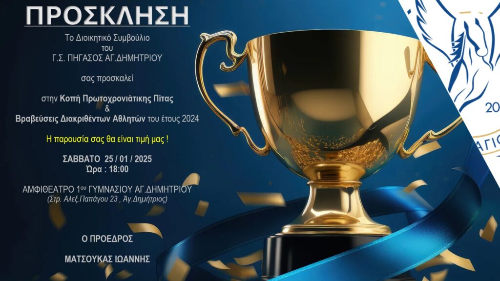Το ΔΣ του Αθλητικού Σωματείου Κλασικού Αθλητισμού ΓΣ ΠΗΓΑΣΟΣ ΑΓΙΟΥ ΔΗΜΗΤΡΙΟΥ, σας προσκαλεί στην Ετήσια Κοπή της Πρωτοχρονιάτικης Πίτας & τις Βραβεύσεις αθλητών, το Σάββατο 25/1/2025 στο αμφιθέατρο του 1ου Γυμνασίου (Στρ. Αλεξ. Παπάγου 23).