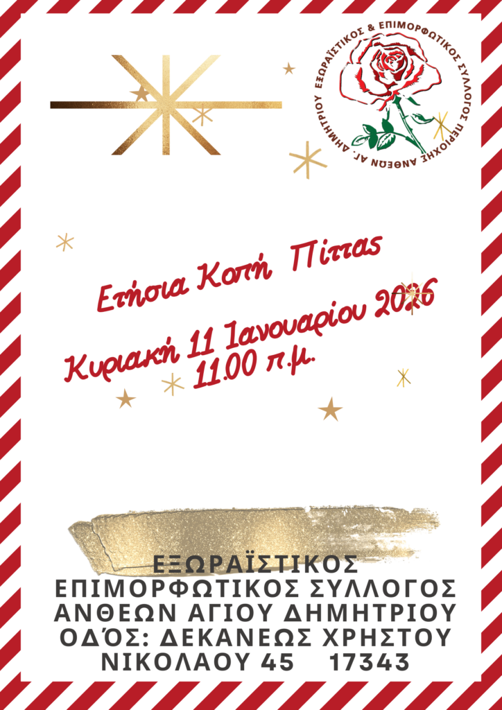 Ο Εξωραϊστικός Επιμορφωτικός Σύλλογος της περιοχής Ανθέων του Δήμου Αγίου Δημητρίου, σας προσκαλεί στην κοπή της ετήσιας πίτας του, την Κυριακή 11 Ιανουαρίου 2026, στις 11 π.μ.