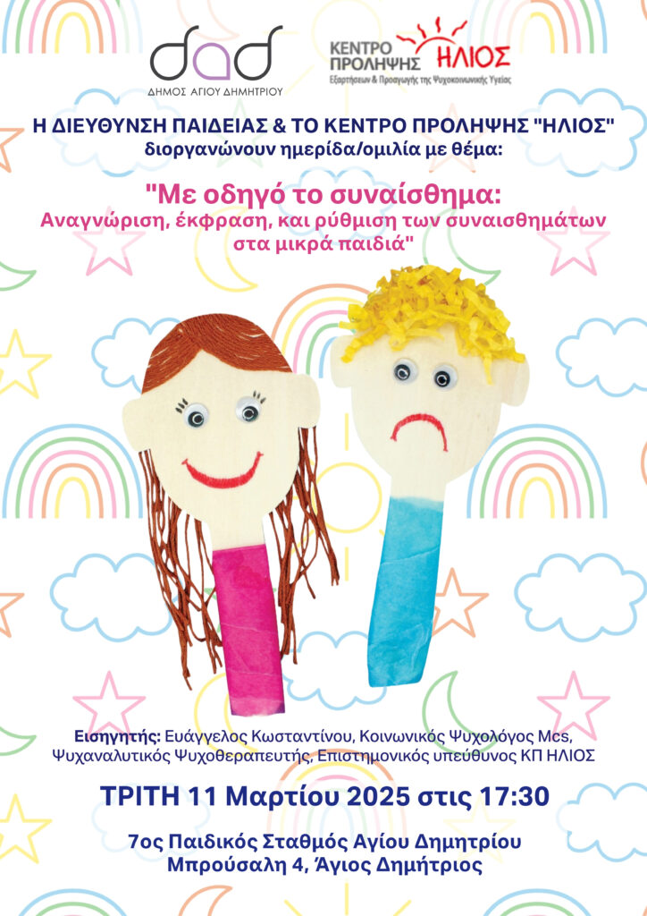 Η Διεύθυνση Παιδείας του Δήμου Αγίου Δημητρίου και το Κέντρο Πρόληψης Εξαρτήσεων & Προαγωγής της Ψυχοκοινωνικής Υγείας “Ήλιος”, διοργανώνουν ημερίδα/ομιλία με θέμα: «Με οδηγό το συναίσθημα: Αναγνώριση, έκφραση και ρύθμιση των συναισθημάτων στα μικρά παιδιά».