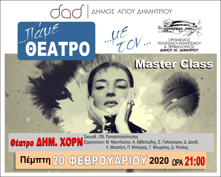 Ο Οργανισμός Πολιτισμού, Αθλητισμού & Περιβάλλοντος υπενθυμίζει, σε όσες και όσους είχαν κάνει τη σχετική κράτηση, τη θεατρική παράσταση Master Class, που θα γίνει την Πέμπτη 20/2/2020 και ώρα 21:00, στο θέατρο “Δημήτρης Χορν”.-
