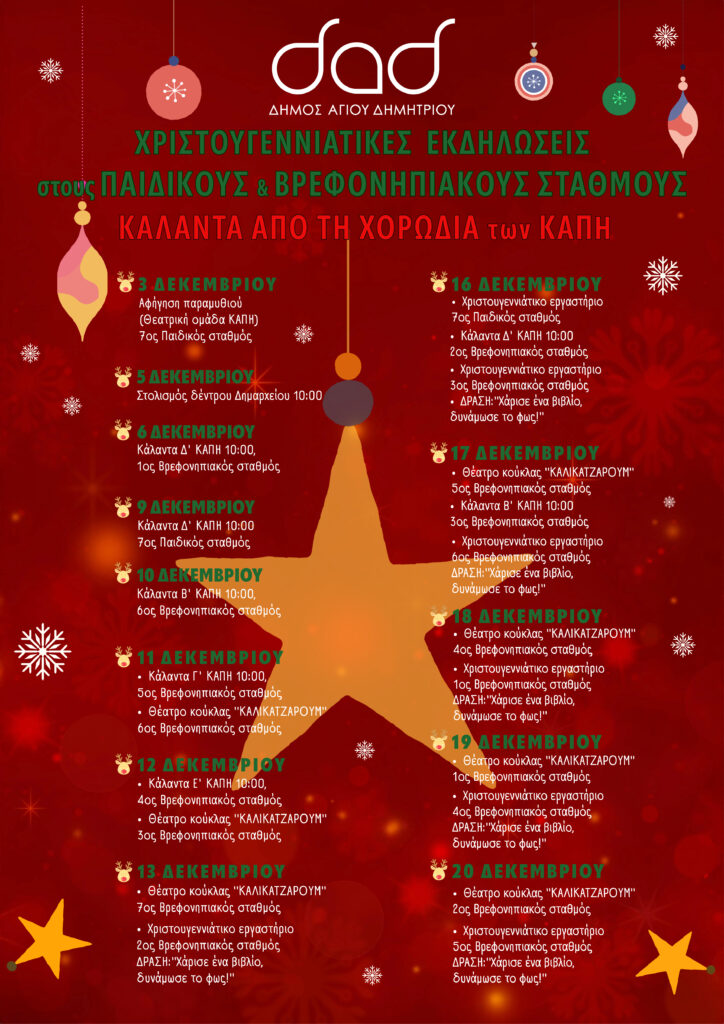 Πλήθος εικαστικών εργαστηρίων με χριστουγεννιάτικες κατασκευές και παιχνίδια, θα διεξαχθούν σε όλους τους Παιδικούς & Βρεφονηπιακούς σταθμούς.