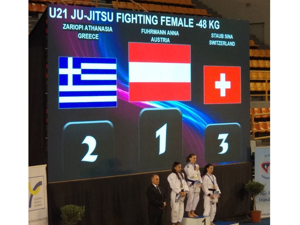Από τις 25 έως τις 27 Οκτωβρίου διοργανώθηκε από την Παγκόσμια Ομοσπονδία Ju Jitsu (JJIF) το επίσημο Πανευρωπαϊκό Πρωτάθλημα Ju Jitsu για αθλητές 16-17 (U18) και 18-20 (U21) ετών στο όμορφο Ηράκλειο της Κρήτης. Ο Α.Σ Αγίου Δημητρίου «Η Αδελφότητα» συμμετείχε με μία μόνο αθλήτρια και μέλος της εθνικής ομάδας Ζαριώπη Αθανασία (U21 JuJitsu Fighting female -48kg). Η Νάνσυ μετά από 3 δυνατούς αγώνες κατάφερε να κατακτήσει επίσης το Ασημένιο μετάλλιο. Η κατηγορία αυτή είχε συνολικά 4 συμμετοχές όπου όλες οι αθλήτριες έπρεπε να παίξουν μεταξύ τους. Αναλυτικότερα οι αγώνες της: