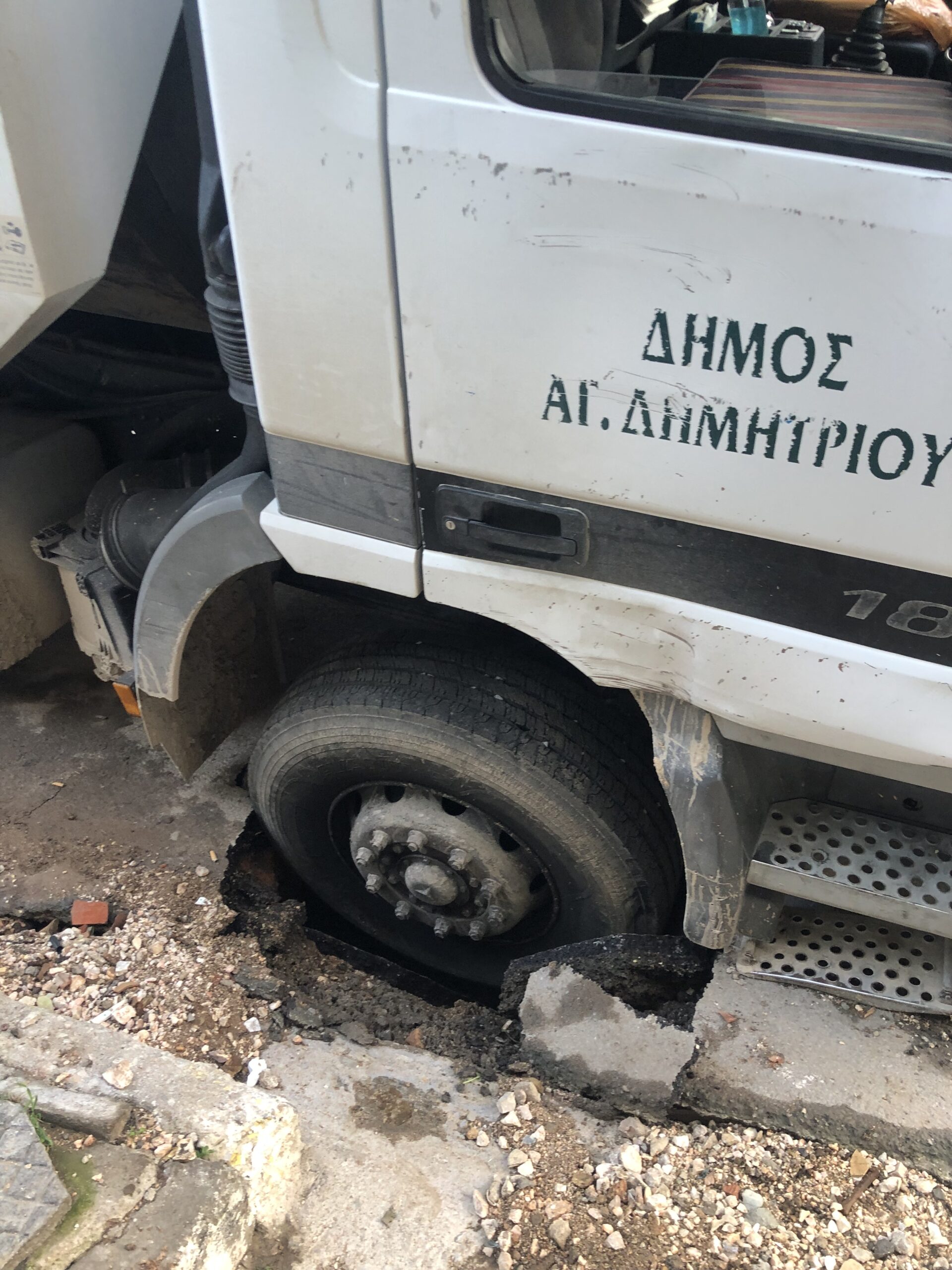 Σοβαρή βλάβη της ΕΥΔΑΠ στην οδό Λιδωρικίου –Υποχώρησε το οδόστρωμα  και εγκλωβίστηκε απορριμματοφόρο