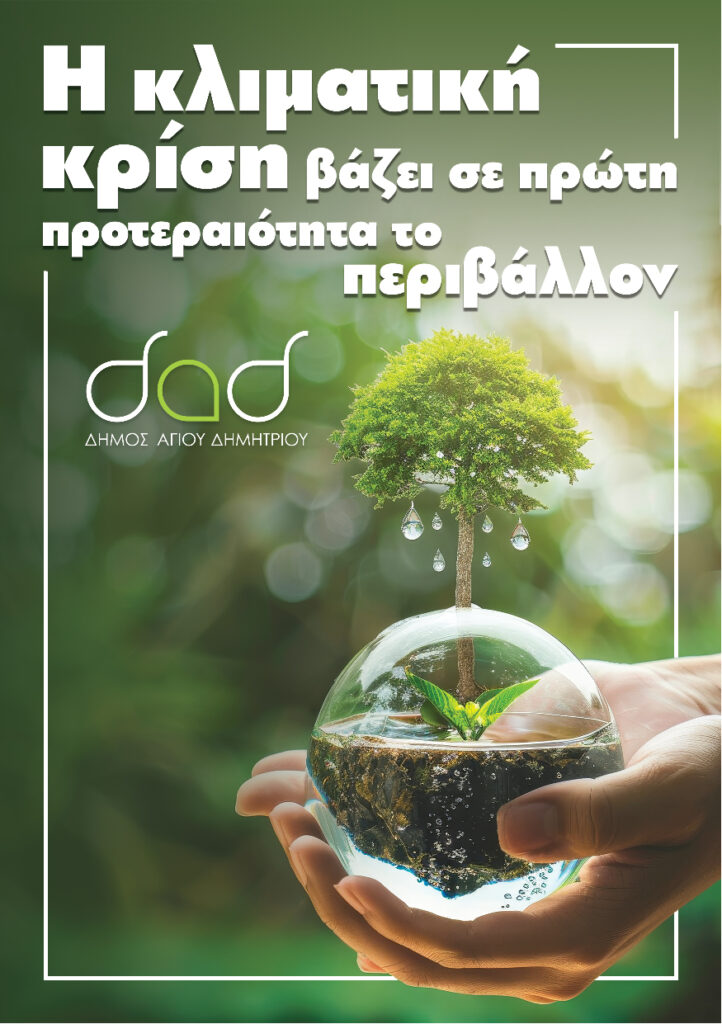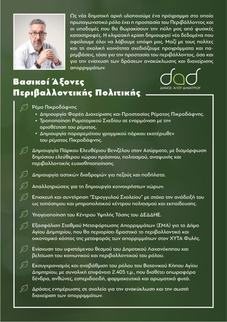 Ως νέα δημοτική αρχή υλοποιούμε ένα πρόγραμμα στο οποίο πρωταγωνιστικό ρόλο έχει η προστασία του Περιβάλλοντος και οι υποδομές που θα θωρακίσουν την πόλη μας από φυσικές καταστροφές. Η κλιματική κρίση δημιουργεί νέα δεδομένα που οφείλουμε όλοι να λάβουμε υπόψη μας. Μαζί με τους πολίτες και τη σχολική κοινότητα σχεδιάζουμε προγράμματα και παρεμβάσεις, τόσο για την προστασία του περιβάλλοντος, όσο και για την ενίσχυση των δράσεων ανακύκλωσης και διαχείρισης απορριμμάτων.